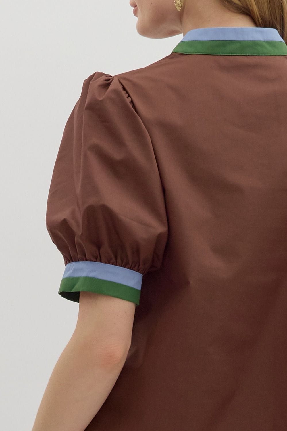Solid short bubble sleeve featuring multicolor band finish. Unlined. Woven. Semi-sheer. Lightweight.