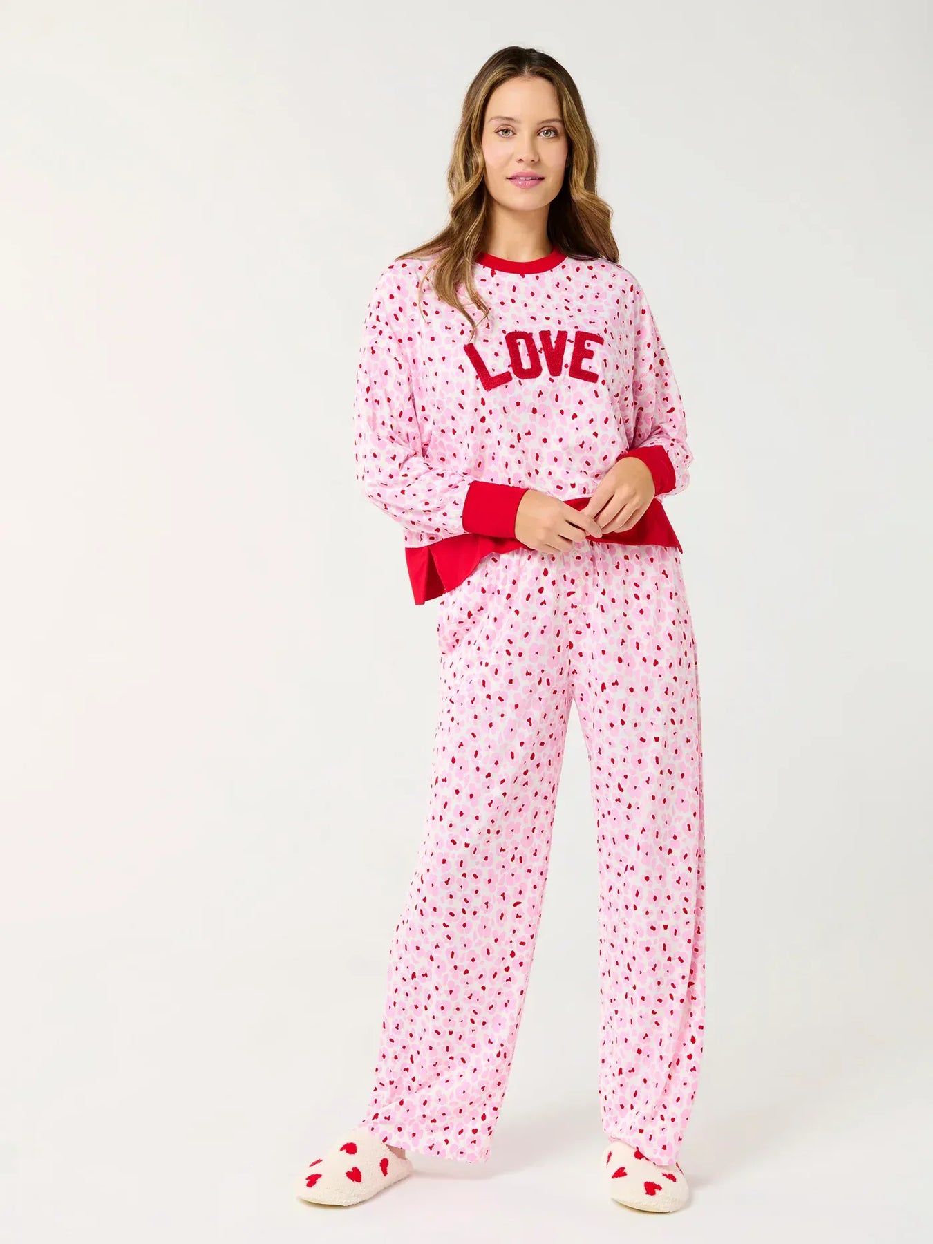 Fall in love with the Floral “Love” Ultra-Soft Jersey Knit PJ Set, your new cozy companion for lounging in style. This matching set features a relaxed fit long sleeve top with contrast red trim and chenille “Lpve” lettering for a pop of playful texture. The coordinating pants include on-seam pockets and a 29" inseam for just-right comfort. Whether you're curling up with a good book or celebrating a cozy night in, this set brings sweet vibes to your downtime.