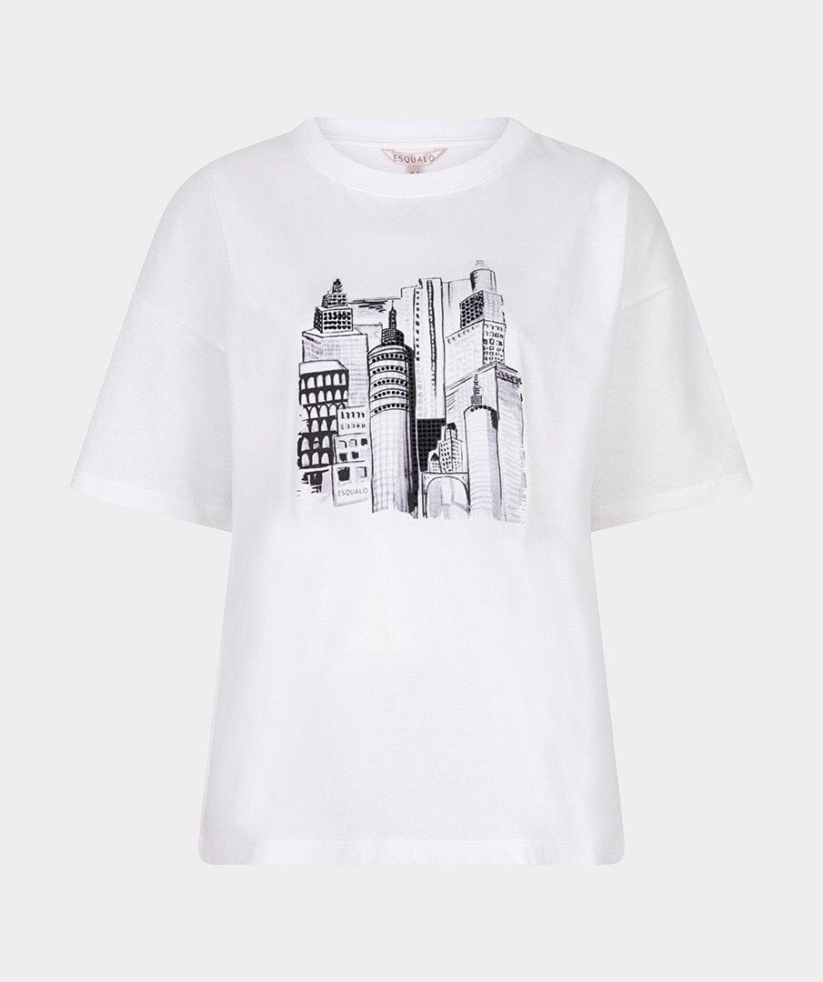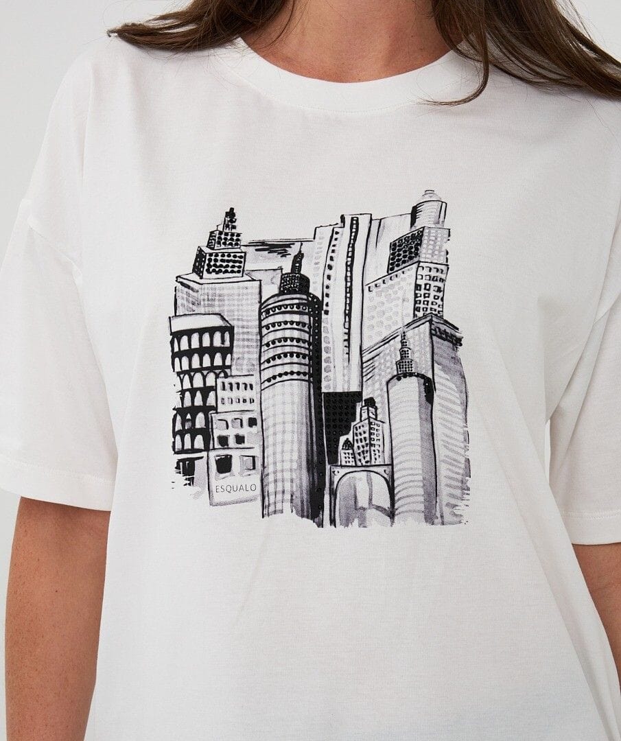 T-shirt with skyline print with pretty little black rhinestones. The top is made of 100% cotton. Model is 1.73m and wears size S.