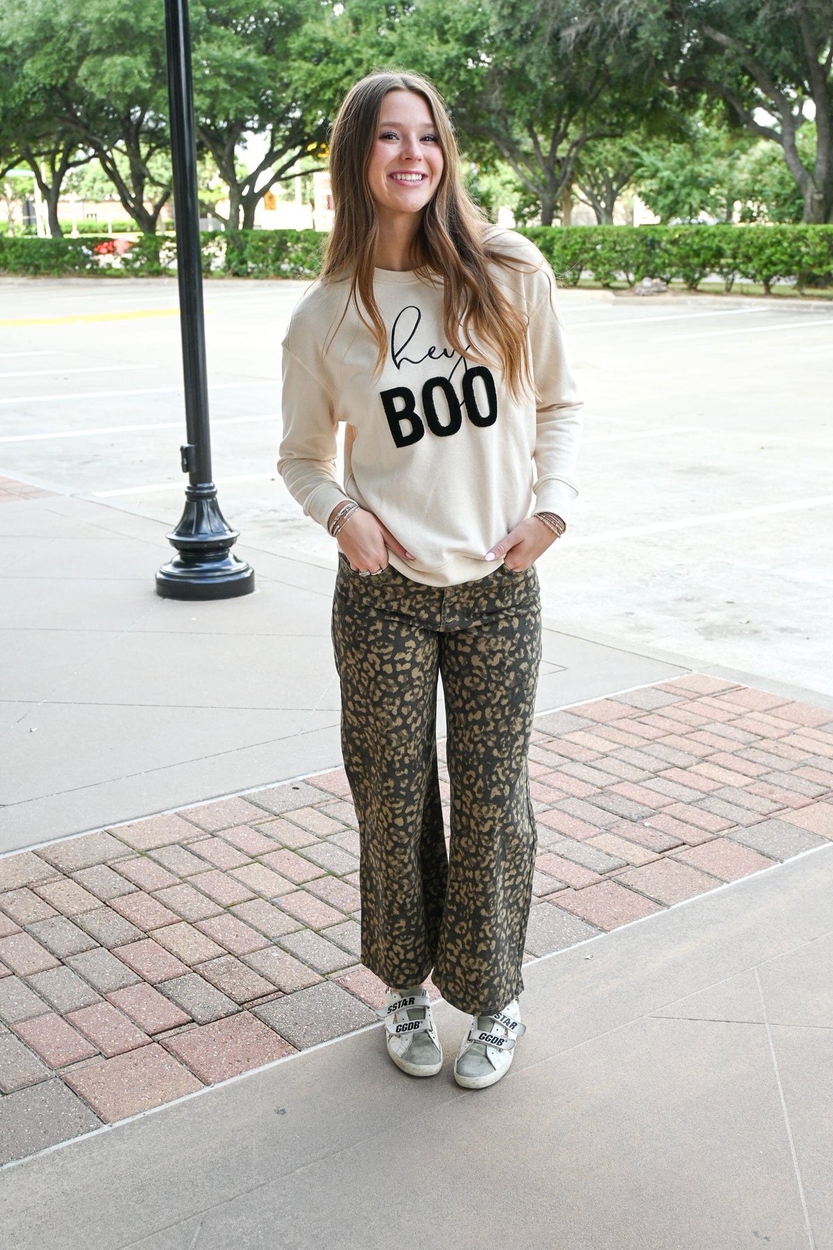 Stay warm and stylish in this versatile and effortlessly cool knitwear staple. Wear it alone or layered, it's the perfect sweater for the season and you'll wish you had it in every color. "Hey Boo" Sweatshirt, crafted for comfort and fun. This long sleeve sweatshirt features a blend of cotton and polyester with a classic crewneck design. It offers a pull-on closure for easy wear. Care for it with a machine wash on a cold, gentle cycle, followed by a low tumble dry to maintain its cozy fit.