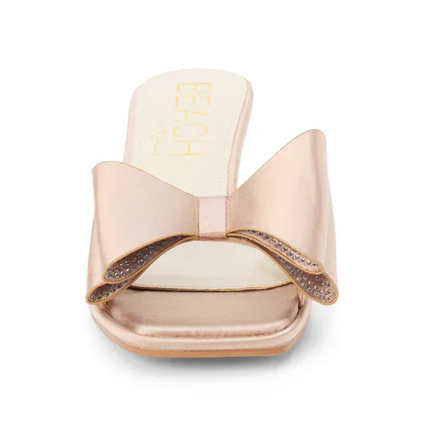 Vegan satin slip-on sandal with kitten heel and oversized double bow detail.