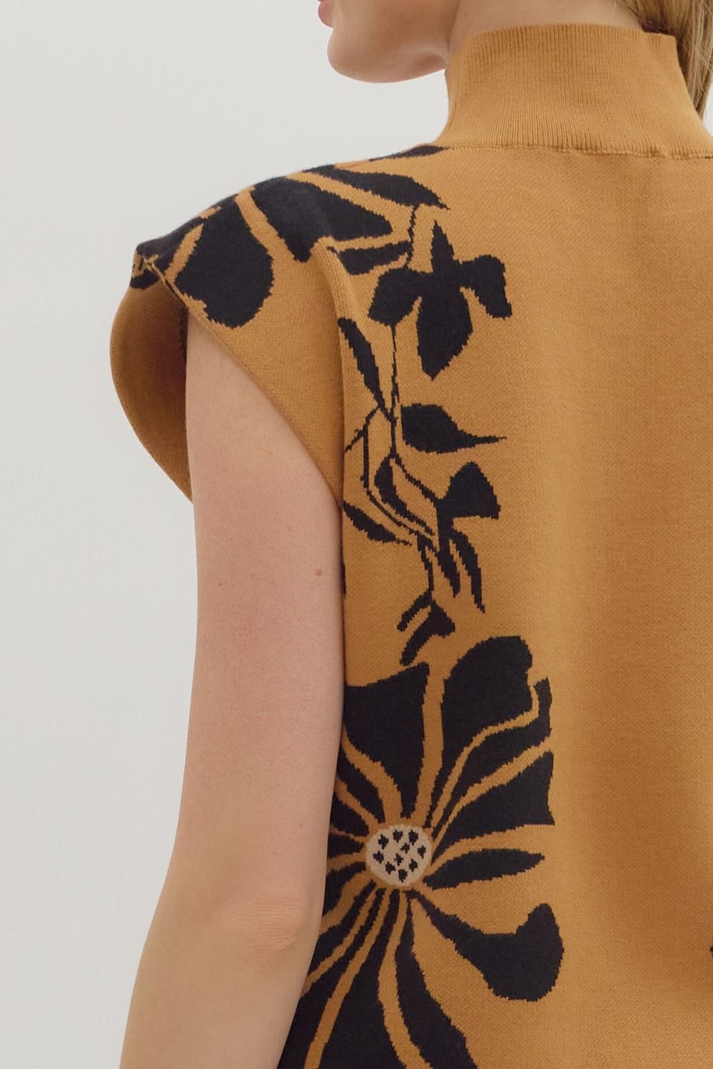 Floral pattern high neck muscle sweater knit pullover top. Unlined. Knit. Non-sheer. Lightweight.