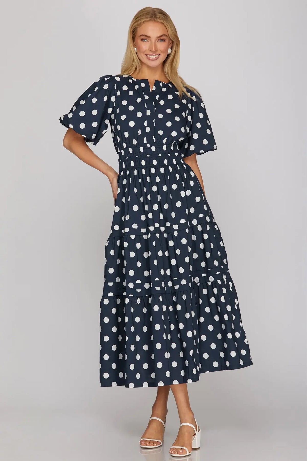 Puff sleeve waist elastic woven polka dot print pintuck midi dress with pockets