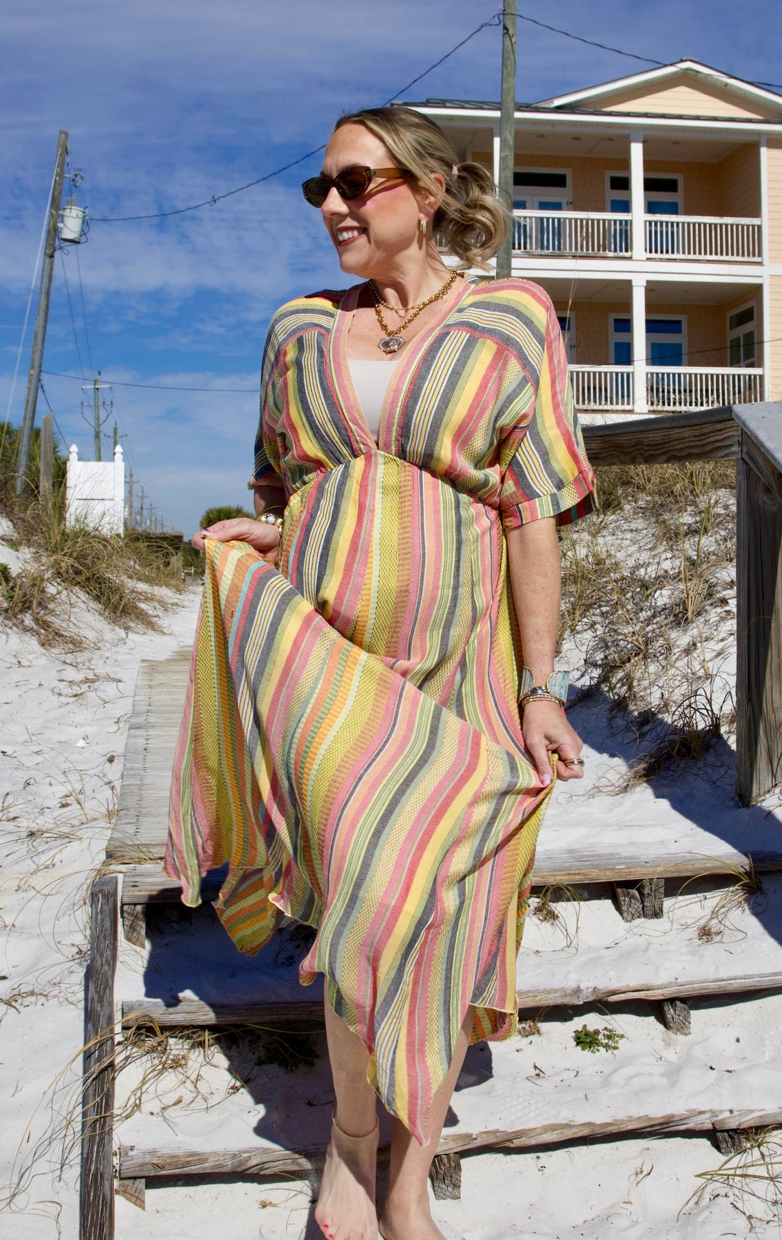 Kimono Sleeve Multicolor Striped V-Neck Midi Dress