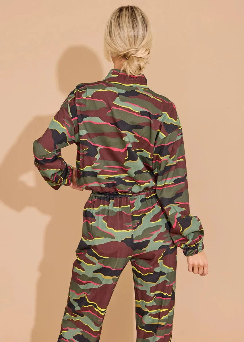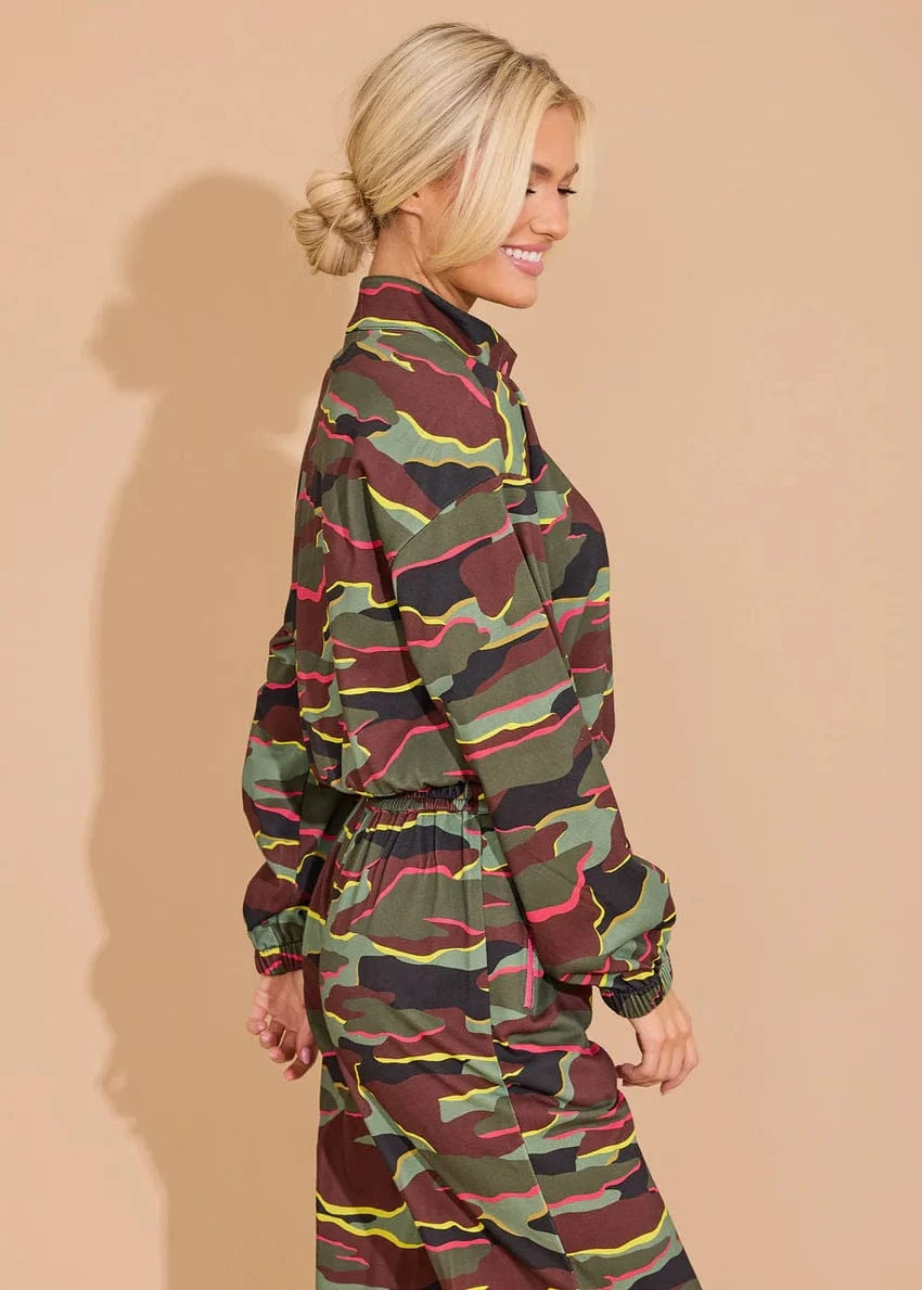 Introducing... The Frankie Top! Freshen up your fall wardrobe with this effortlessly chic cropped top with an elastic waistband, snap button collar, and long sleeves in our new Neon Camo print. Pair with our Elton Pant for a head to toe look!