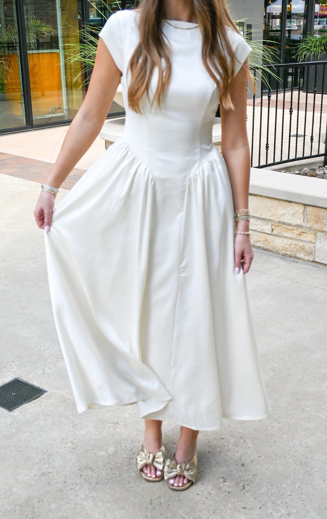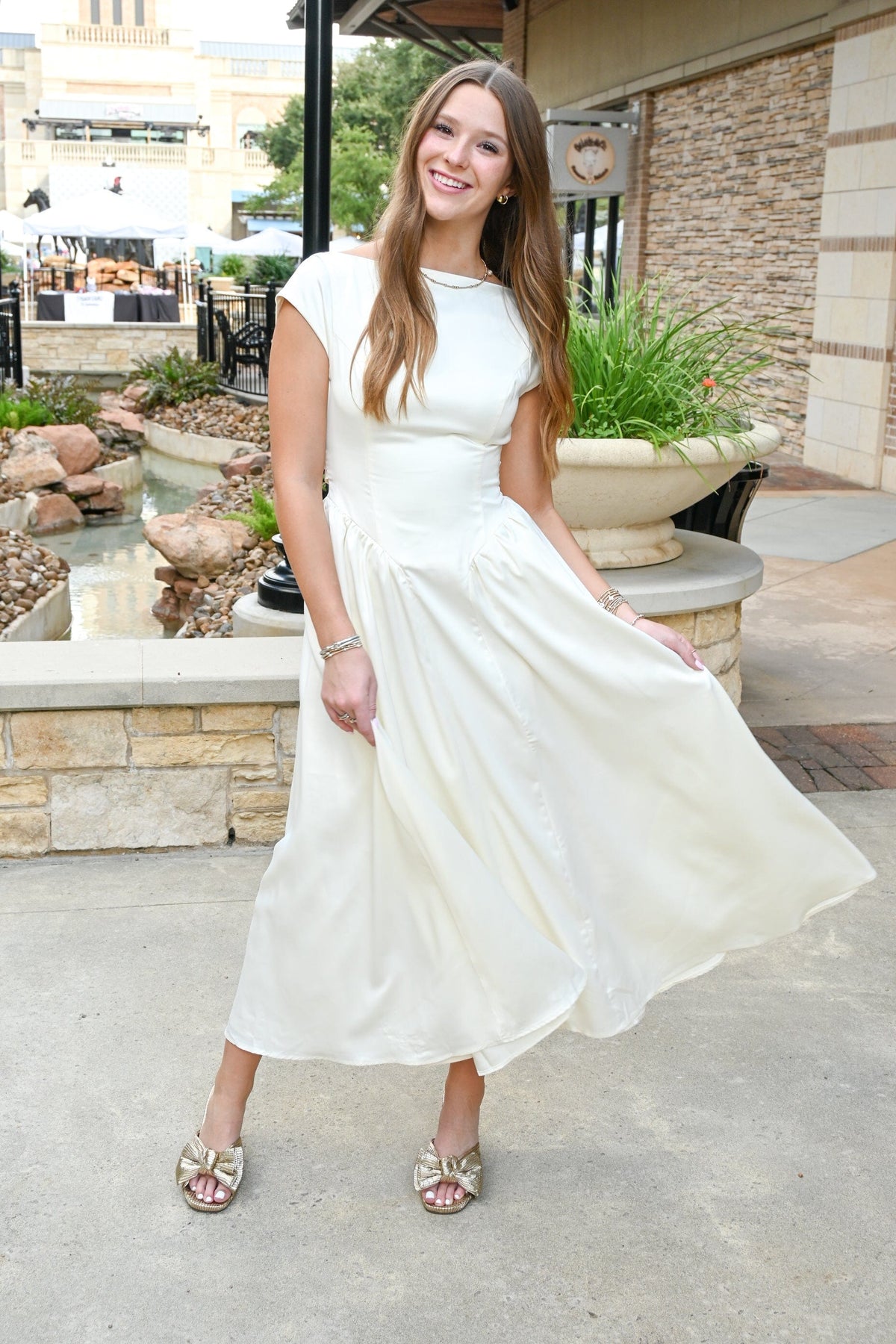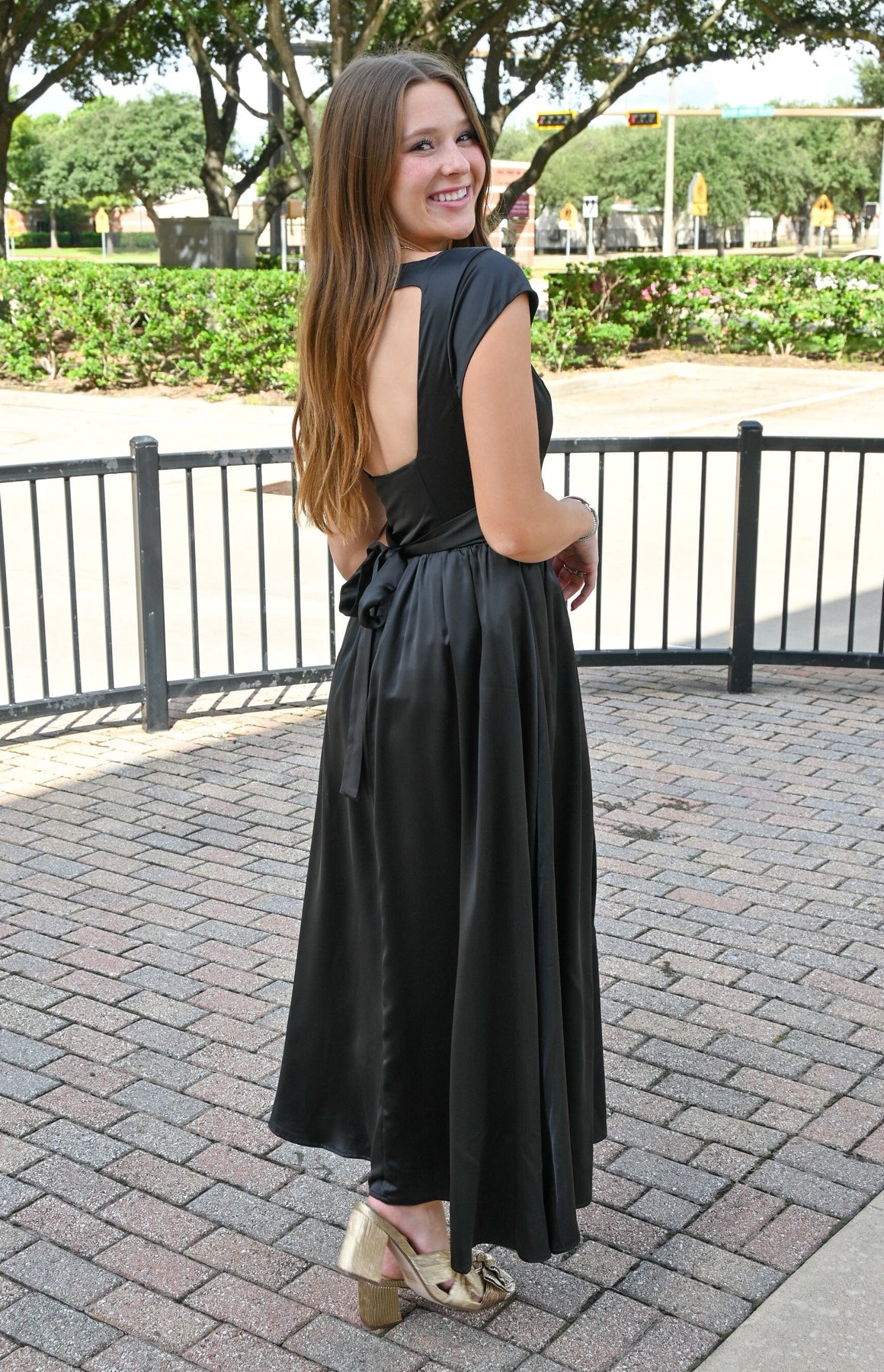 Satin boat neckline cap sleeve open square back gathered midi dress with back self bow tie detail. Back invisible zipper. Lining.