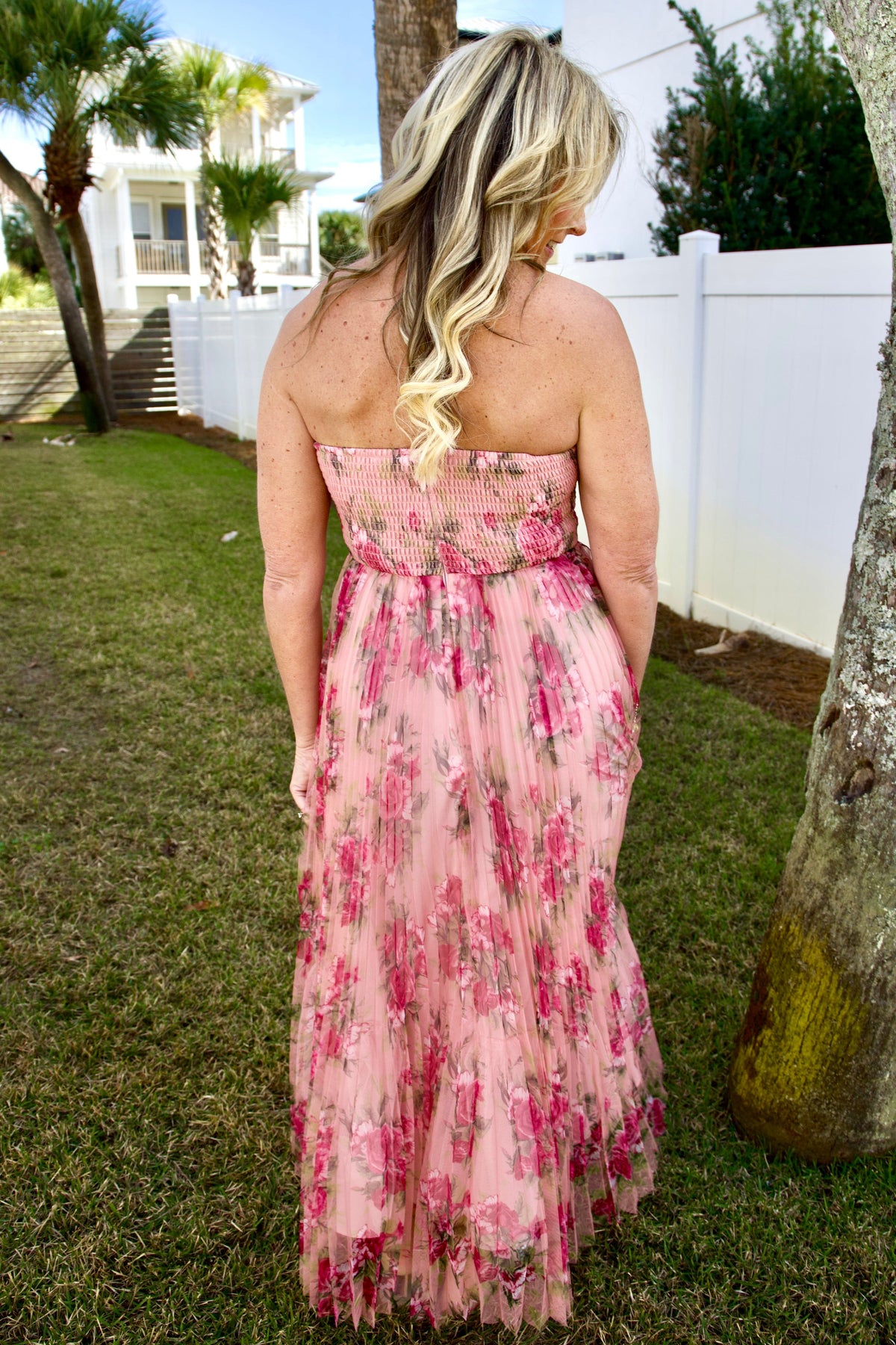 Floral print mesh pleated maxi dress