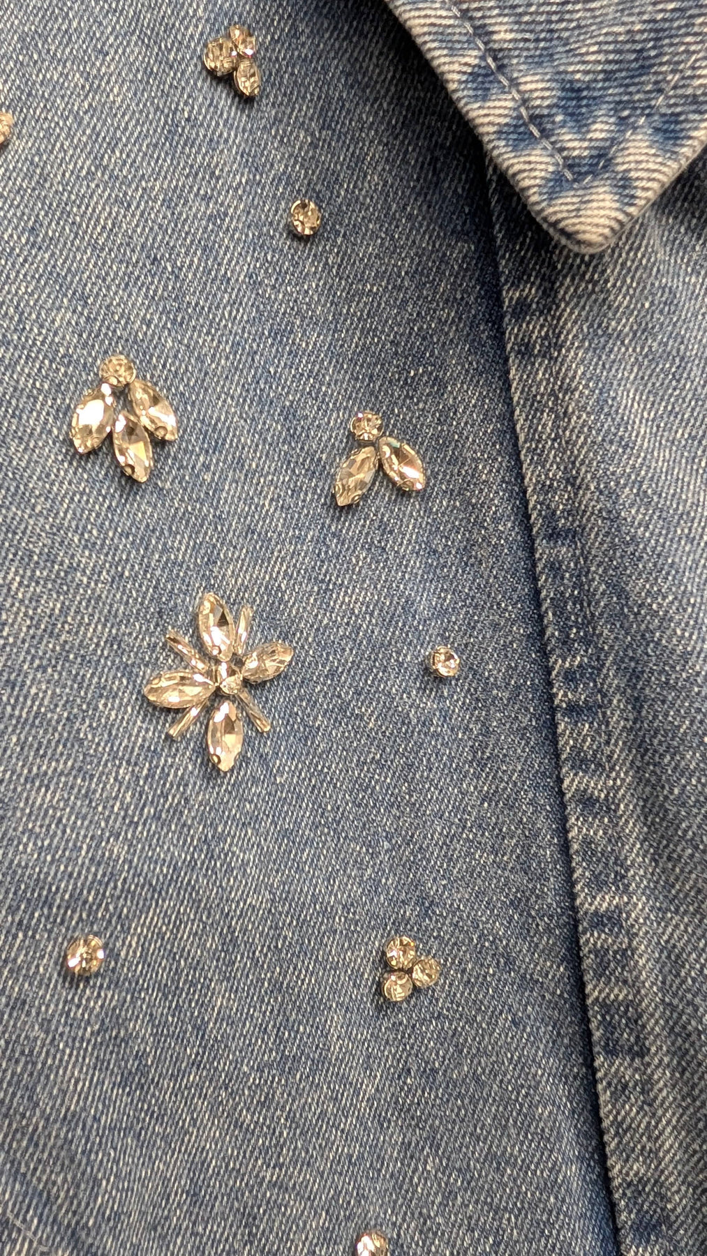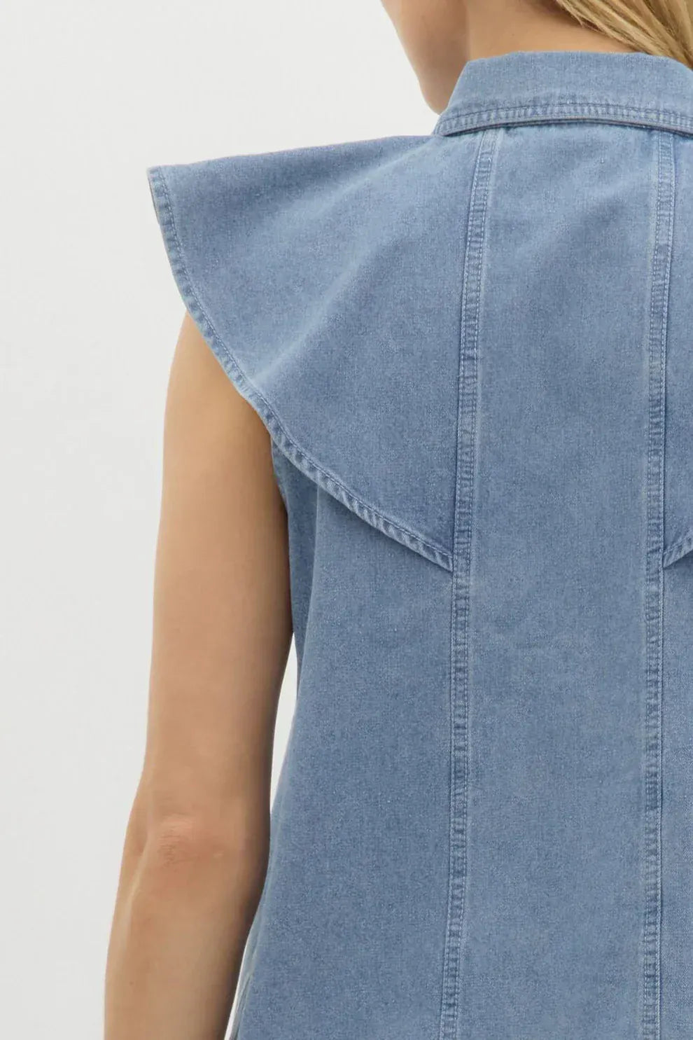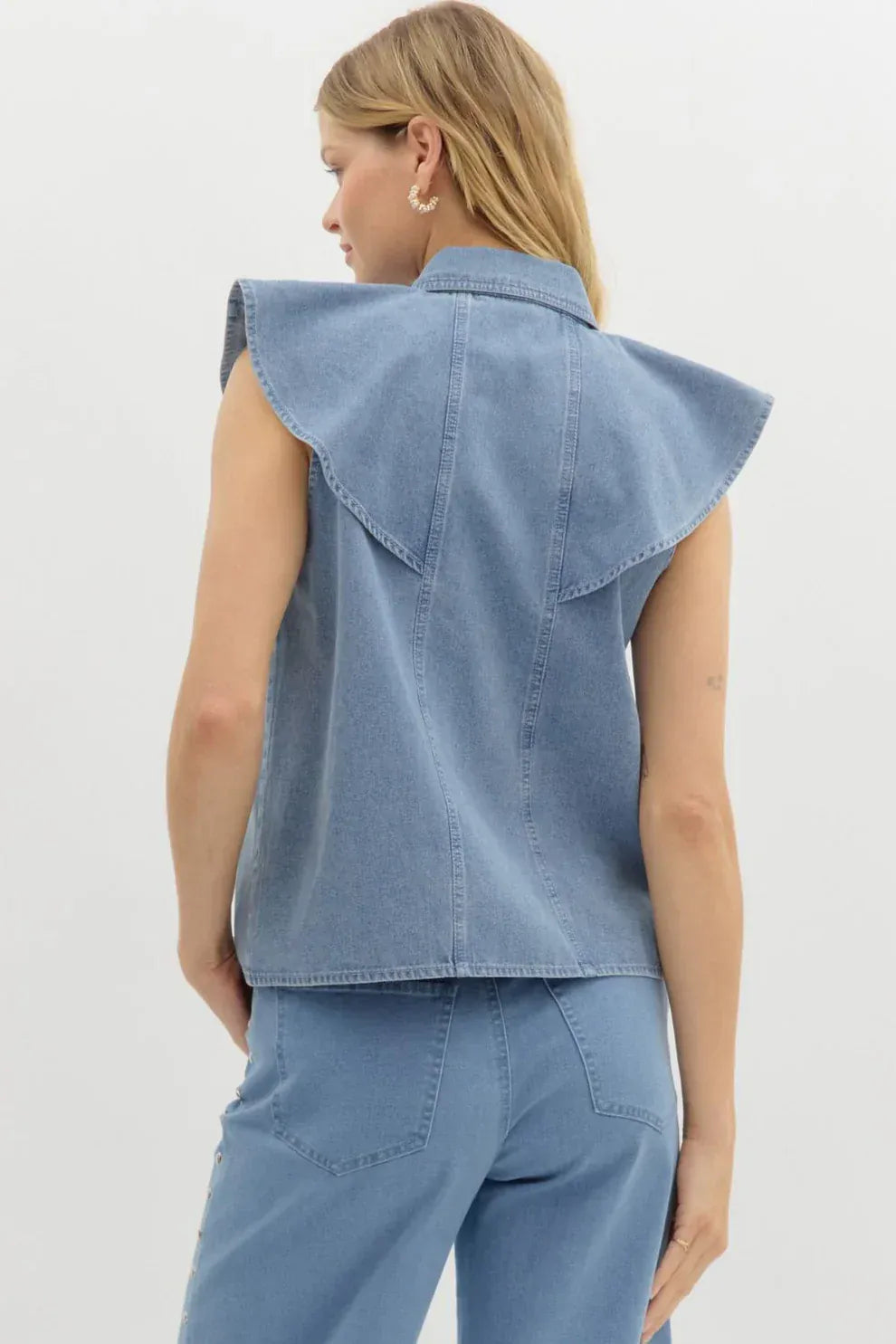Rhinestone embellished denim flutter sleeve collar button front top. Unlined. Woven. Non-sheer. Lightweight.