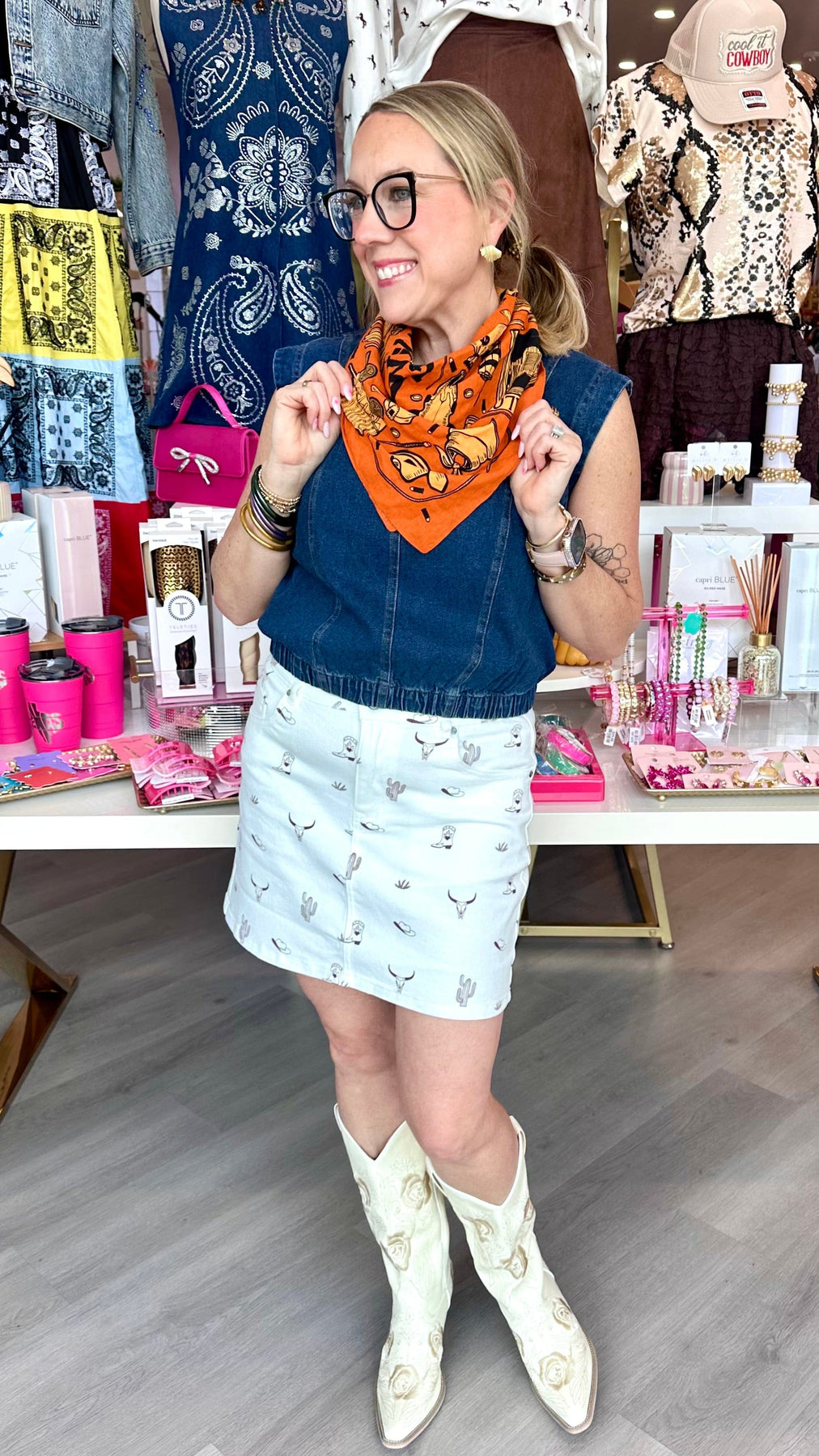 This mineral washed denim Western-inspired mini skirt features an allover cowboy motif print with cowboy boots, horses, stars, cacti, and horseshoes. Designed with a contrast solid waistband and oversized back patch pockets, plus a front button-zip closure and belt loops, this skirt brings playful rodeo charm with everyday functionality.