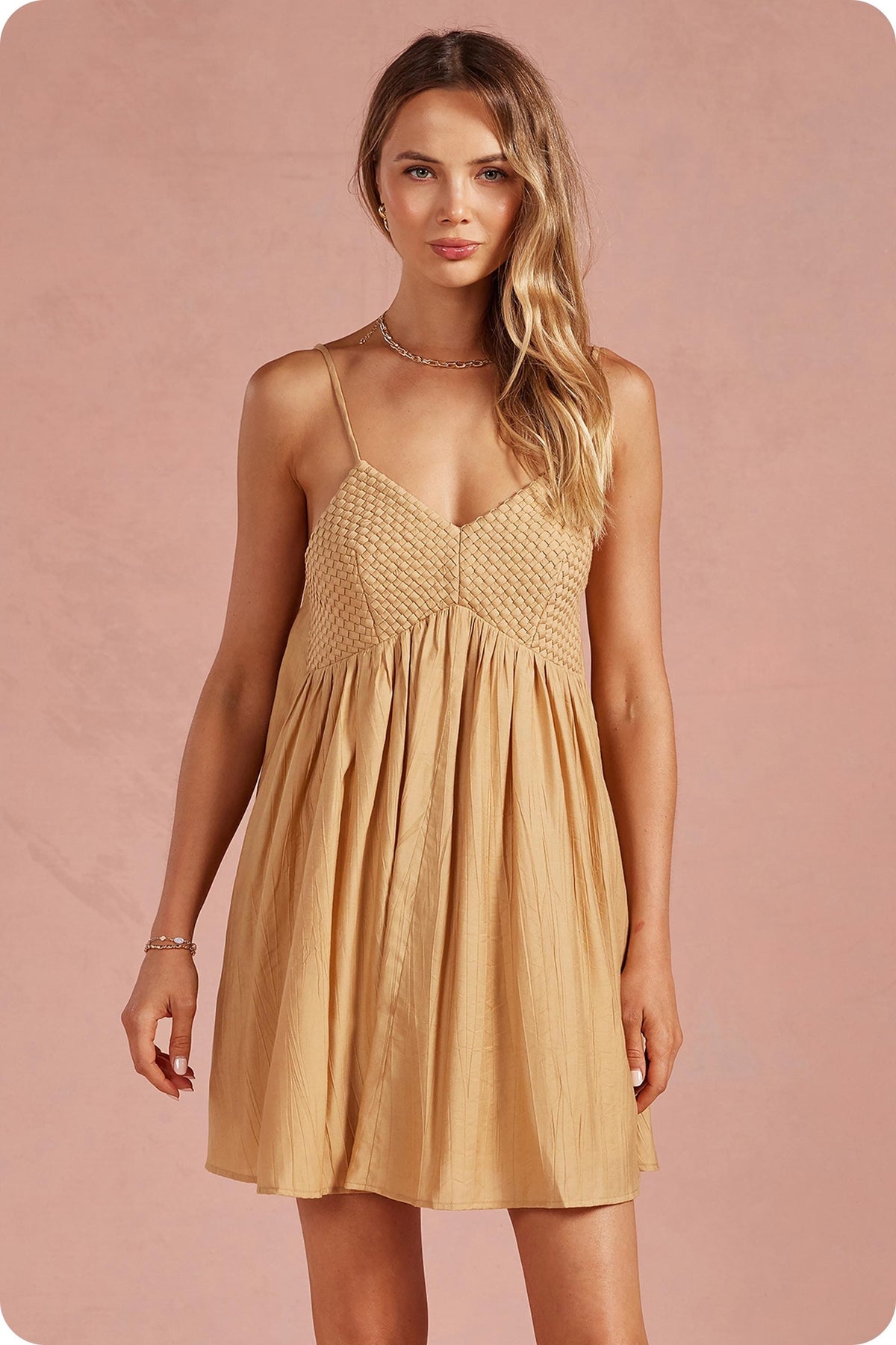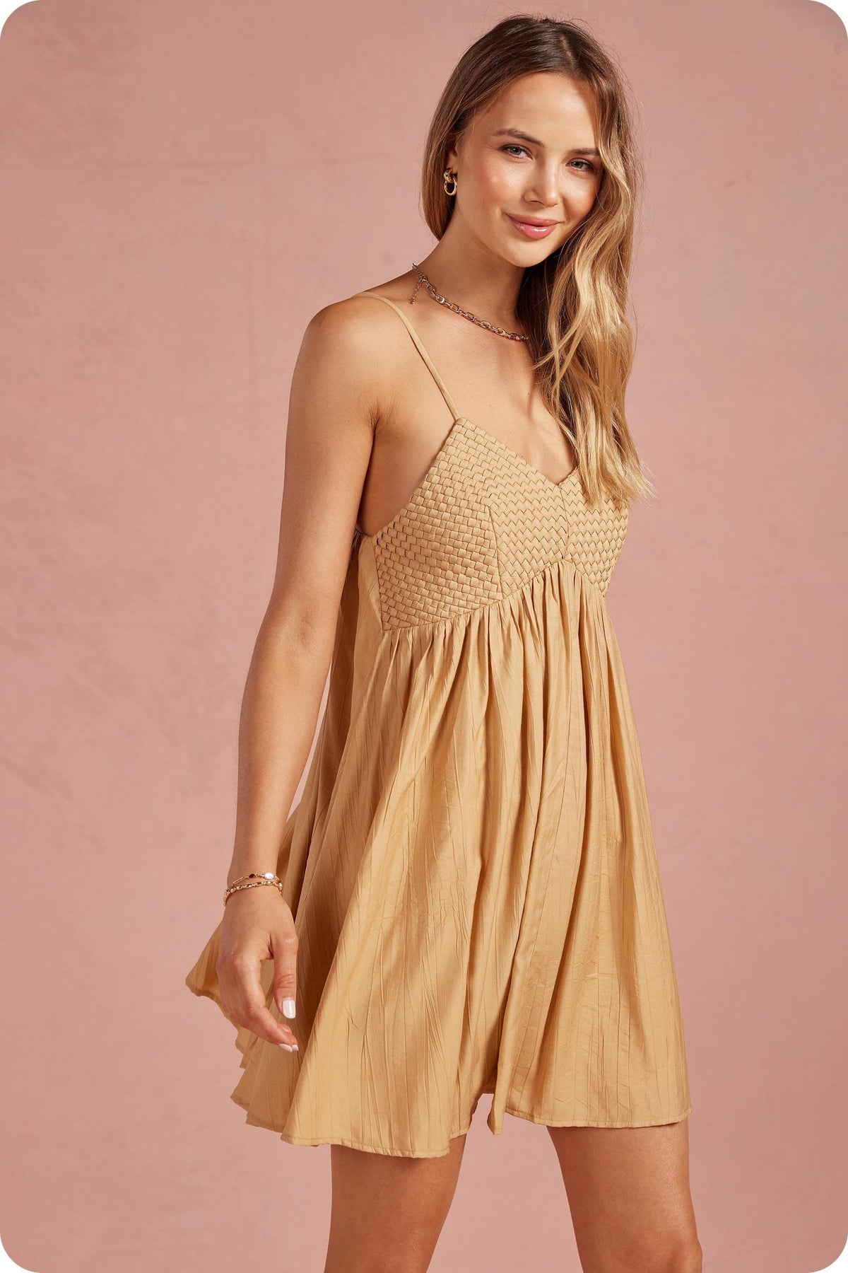 Studio Strut and Bolt Collection. Woven lattice bodice sleeveless mini dress in texture rayon blend fabric. This babydoll mini dress features an unique interwoven basket weave detail at bodice, a classic V-neck, full flowy A-line mini skirt, empire waist, adjustable straps, elastic at back bodice/waist, lining, and side pockets. Whether you're heading out for a weekend brunch, a beachside stroll, or running casual errands, simply pair it with your favorite strappy sandals or white sneakers for an instant, put-together look.