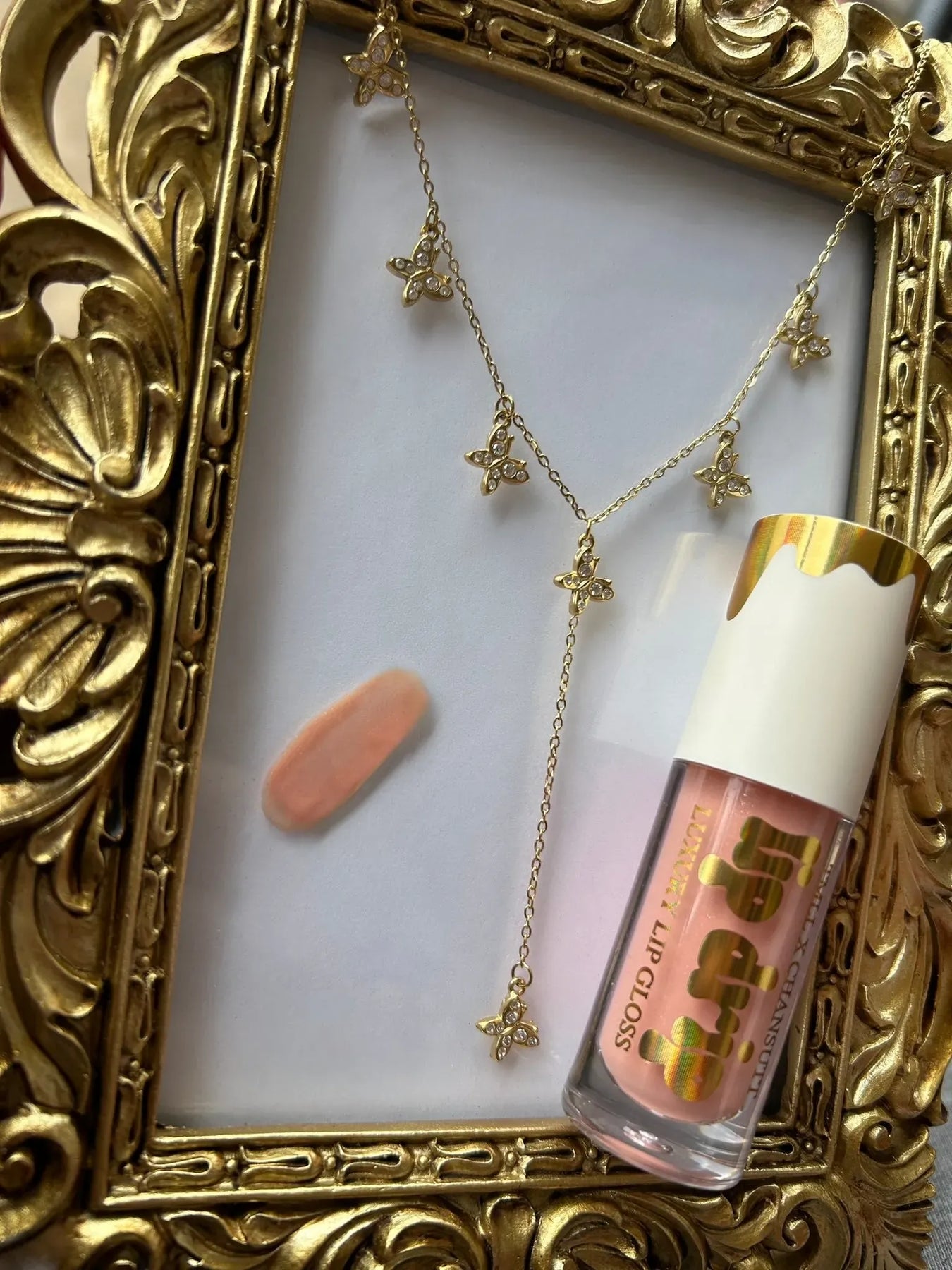 The Set: Includes a 14k gold-dipped butterfly necklace and a luxurious lip gloss.