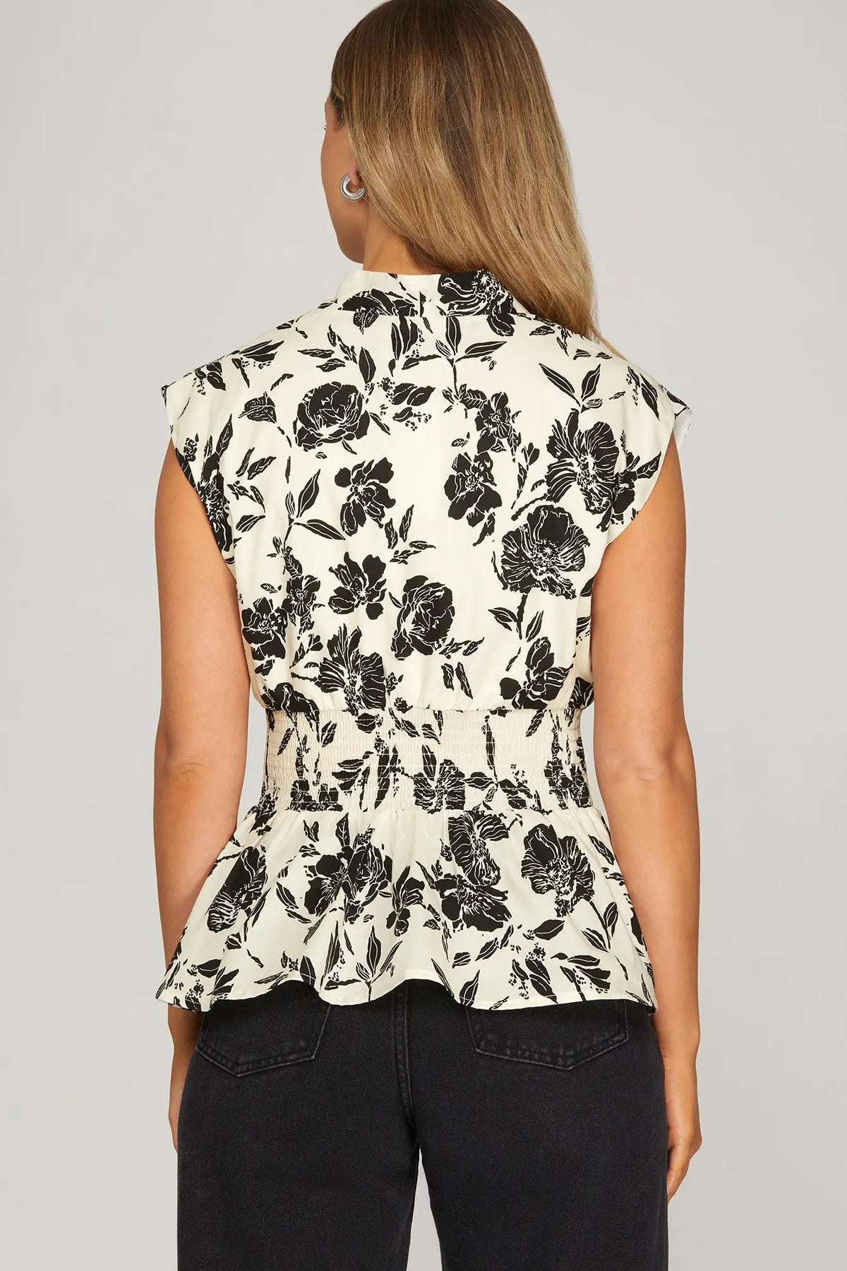 Drop shoulder smocked waist front zip printed top