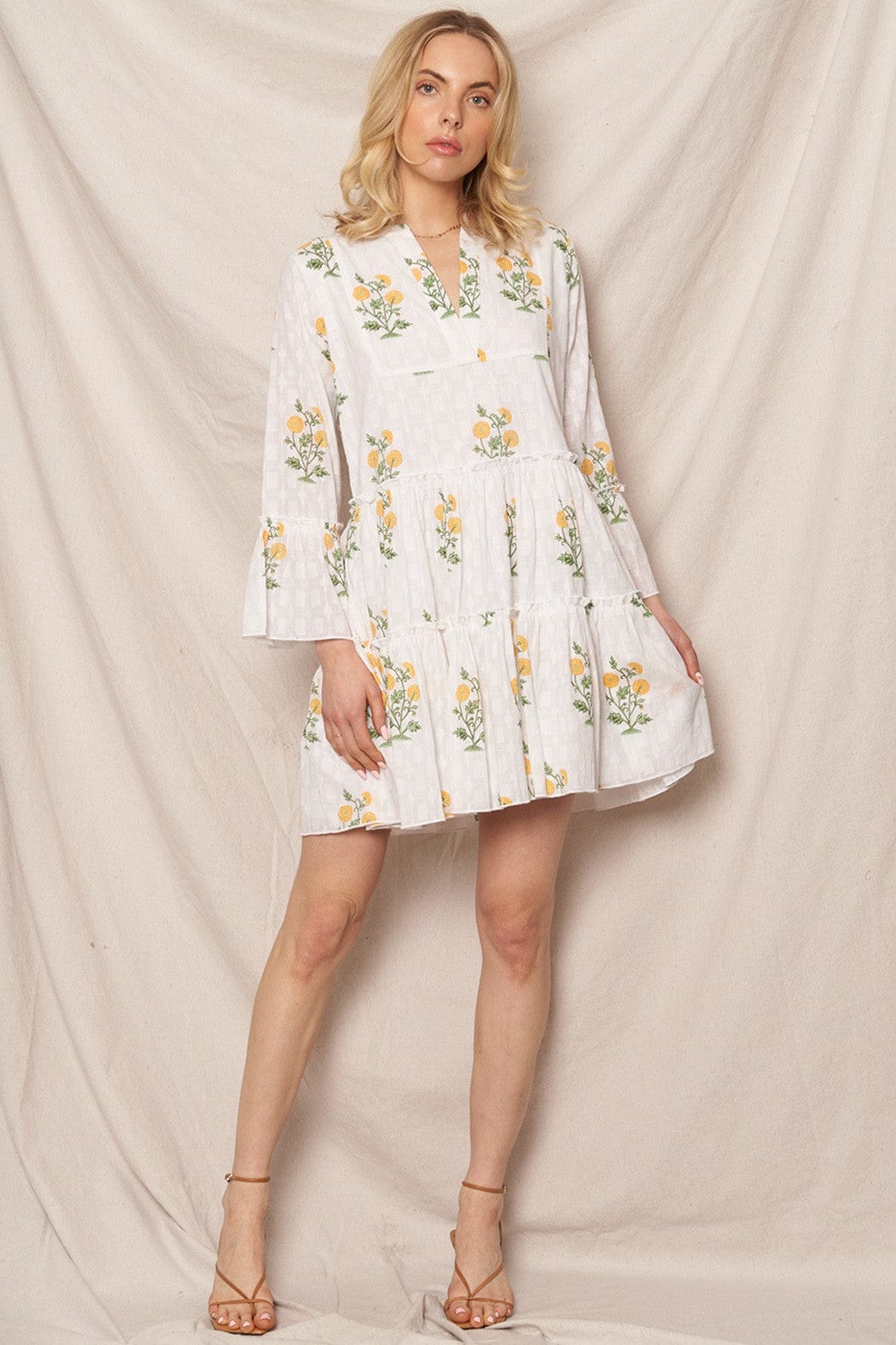 Flower Print 3/4 Sleeve V-Neck Tiered Mini Dress