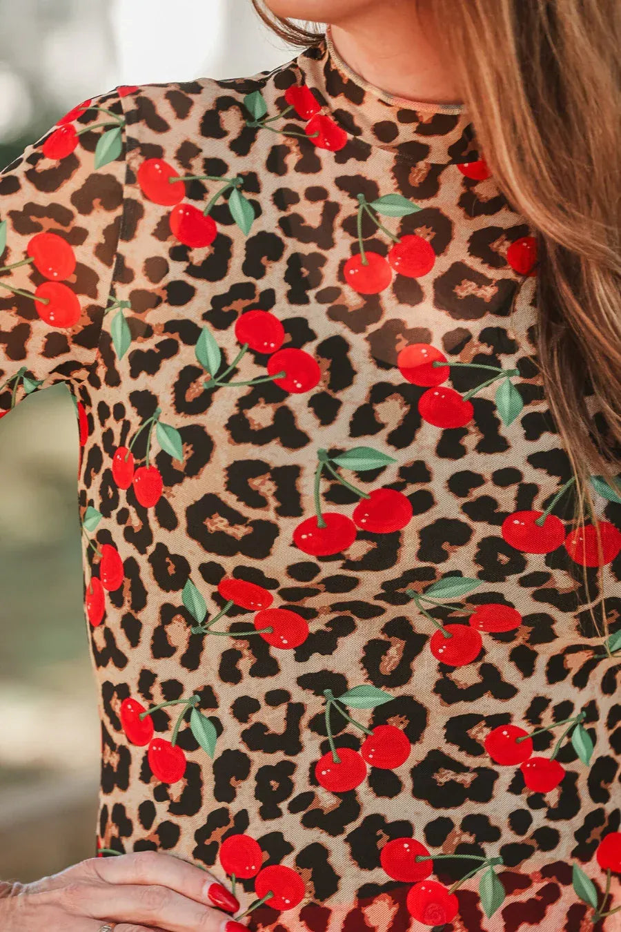 Get ready to make a bold statement in our Kora Short Sleeve Mesh Top! This playful top is a spin on our classic Keigan Mesh with short sleeves. Featuring lettuce hems, a mock neckline, a fun & chic leopard print with cherry accents, and a sheer mesh material that can be layered under or over any outfit. Don't miss out on this must have piece!