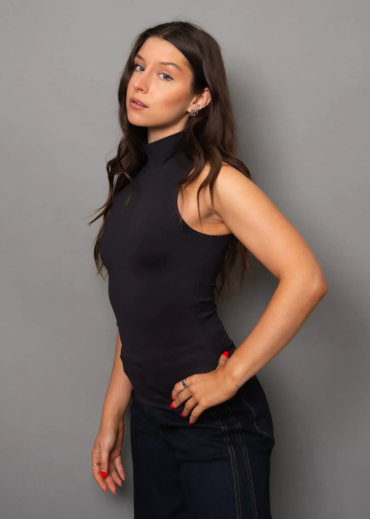 Slip into the Mika 23, a sleeveless mock neck top that feels like a second skin. Made with buttery soft fabric and a clever double layer, it offers comfy coverage while keeping things light and breathable. Perfect for layering or wearing solo, this playful piece adds cozy style to your wardrobe with a smooth, sleek fit you’ll love to flaunt.