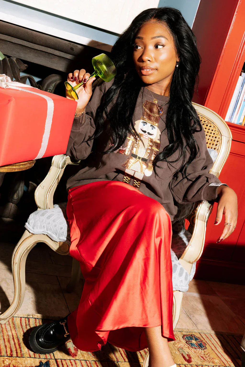 Cozy up this holiday season with this playful brown sweatshirt featuring a festive nutcracker serving an espresso martini. Its slightly oversized fit makes it perfect for relaxed comfort while celebrating your favorite holiday cocktail in style. A fun and festive way to enjoy the season’s spirit!